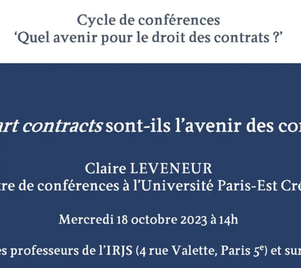 Conférence Image de couverture Le mercredi 18 octobre 2023 14h00 16h00 Premier cycle de conférences "Quel avenir pour le droit des contrats ?" Ajouter à mon calendrier